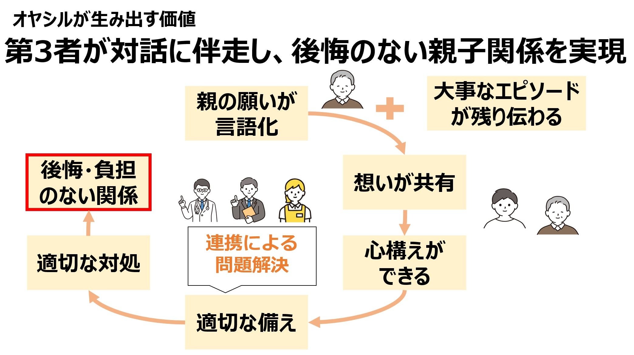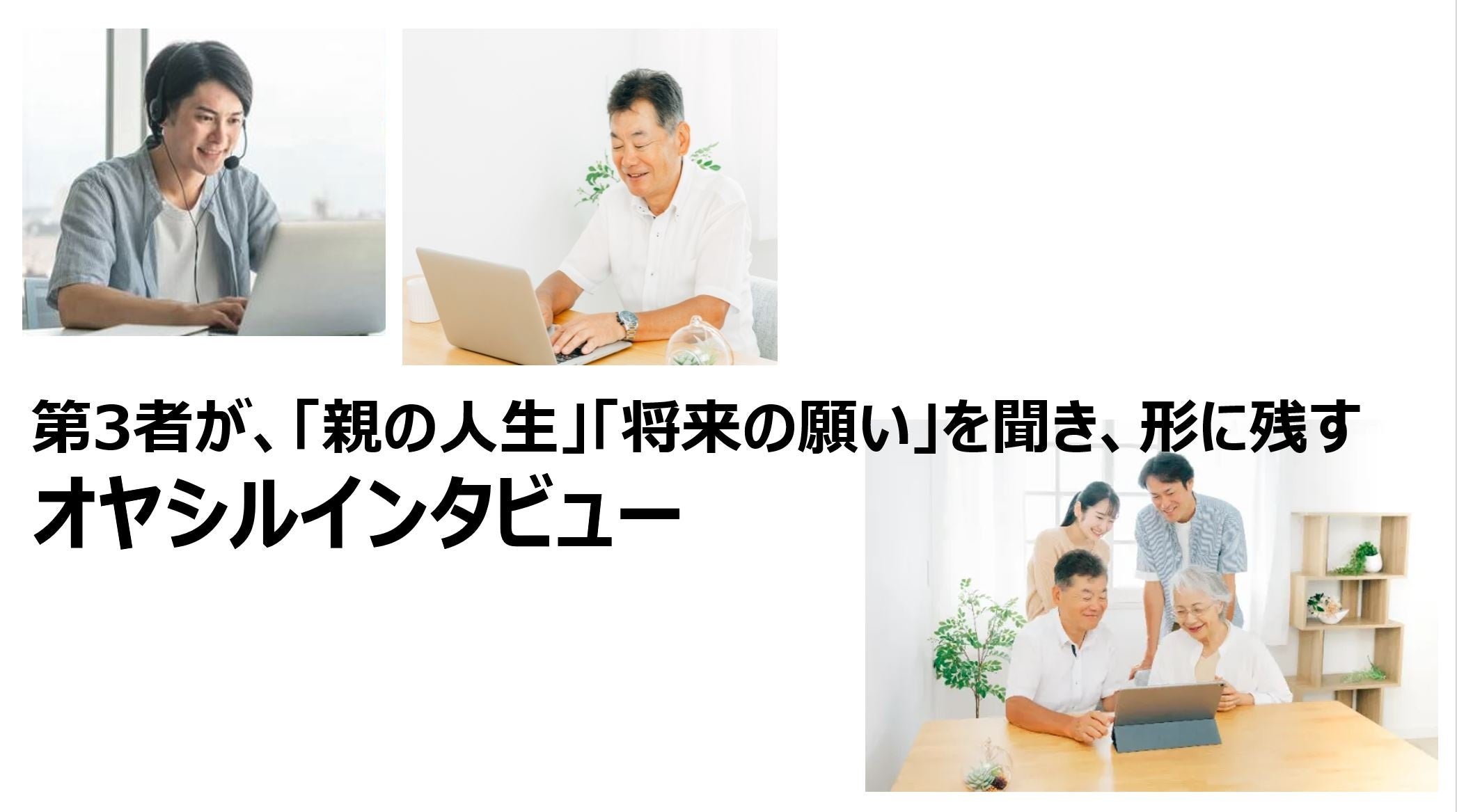 オヤシルは、「後悔のない親子関係が続いていく社会」の実現を目指し、親子だけでは伝わりづらい「これまでの人生」や「これからの願い」を、第三者の聴き手が代わりに聴き、テキストや映像で形に残すインタビュー事業を展開しています。
