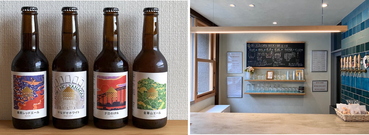 岐阜市初のクラフトビール醸造「岐阜町醸造所」とビアバーを併設。岐阜のまちの風景をイメージしてつくられており「金華山エール」「やながせホワイト」など、地名がついた商品が特徴です。その日ごとにおすすめの銘柄がならび、クラフトビールファン必見の人気店です。