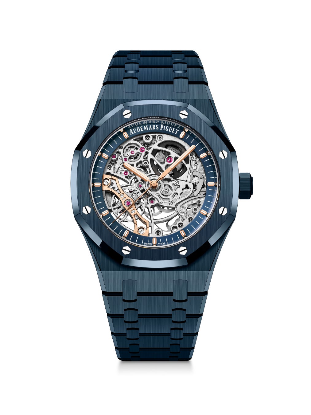 41mmの「ロイヤル オーク ダブル バランスホイール オープンワーク」は、時計全体が“ナイトブルー、クラウド 50”カラーのセラミックで製作。このモノクロデザインが、サファイアクリスタルの文字盤の下に配置されたロジウムトーンのオープンワークムーブメントを際立たせ、ピンクゴールドの針やアワーマーカーなどのディテールにより、印象的な視覚のコントラストを生み出しています。