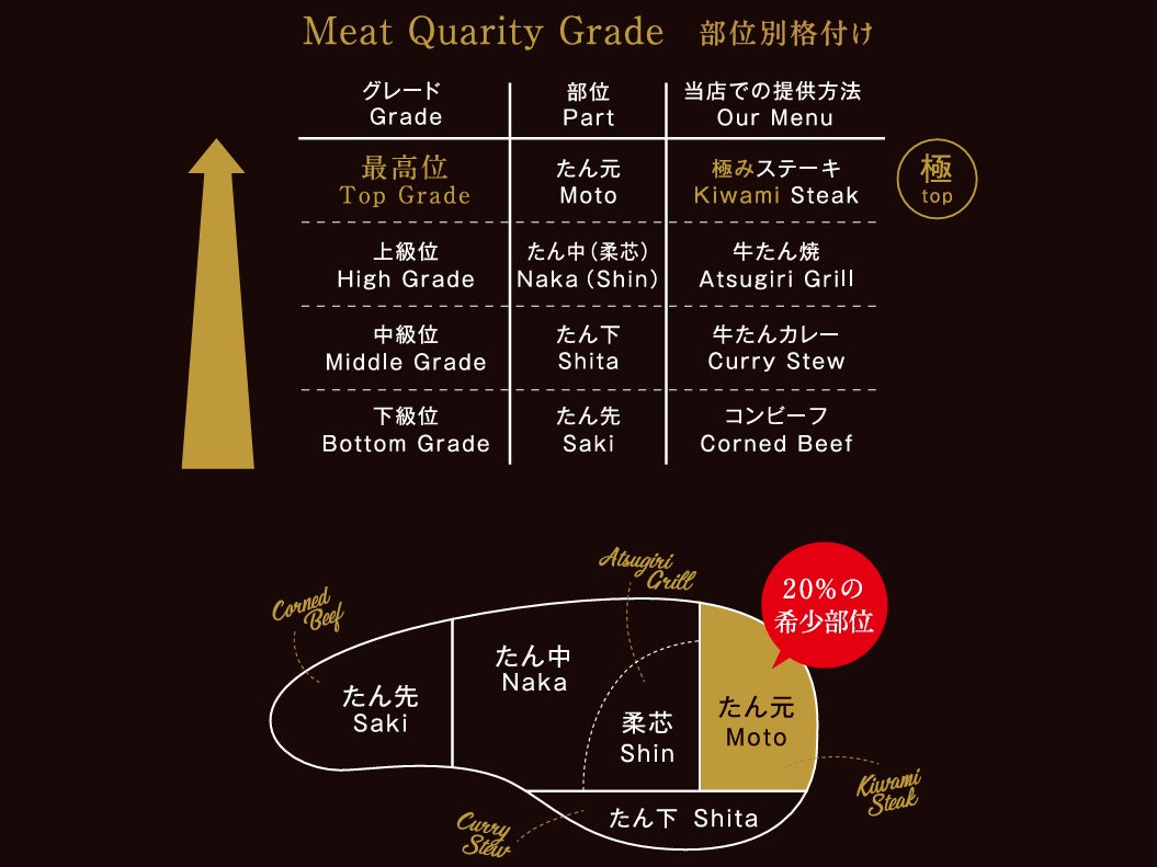 牛たんは、「たん元」「たん中」「たん先」「たん下」の4種類に分かれ、牛1頭からわずか1kg前後しか得られない希少な部位です。このうち「たん元」は全体の20%程度しか取れない最高級部位で、豊かなサシと繊細な食感が特徴。食通にも愛される特別な部位です。