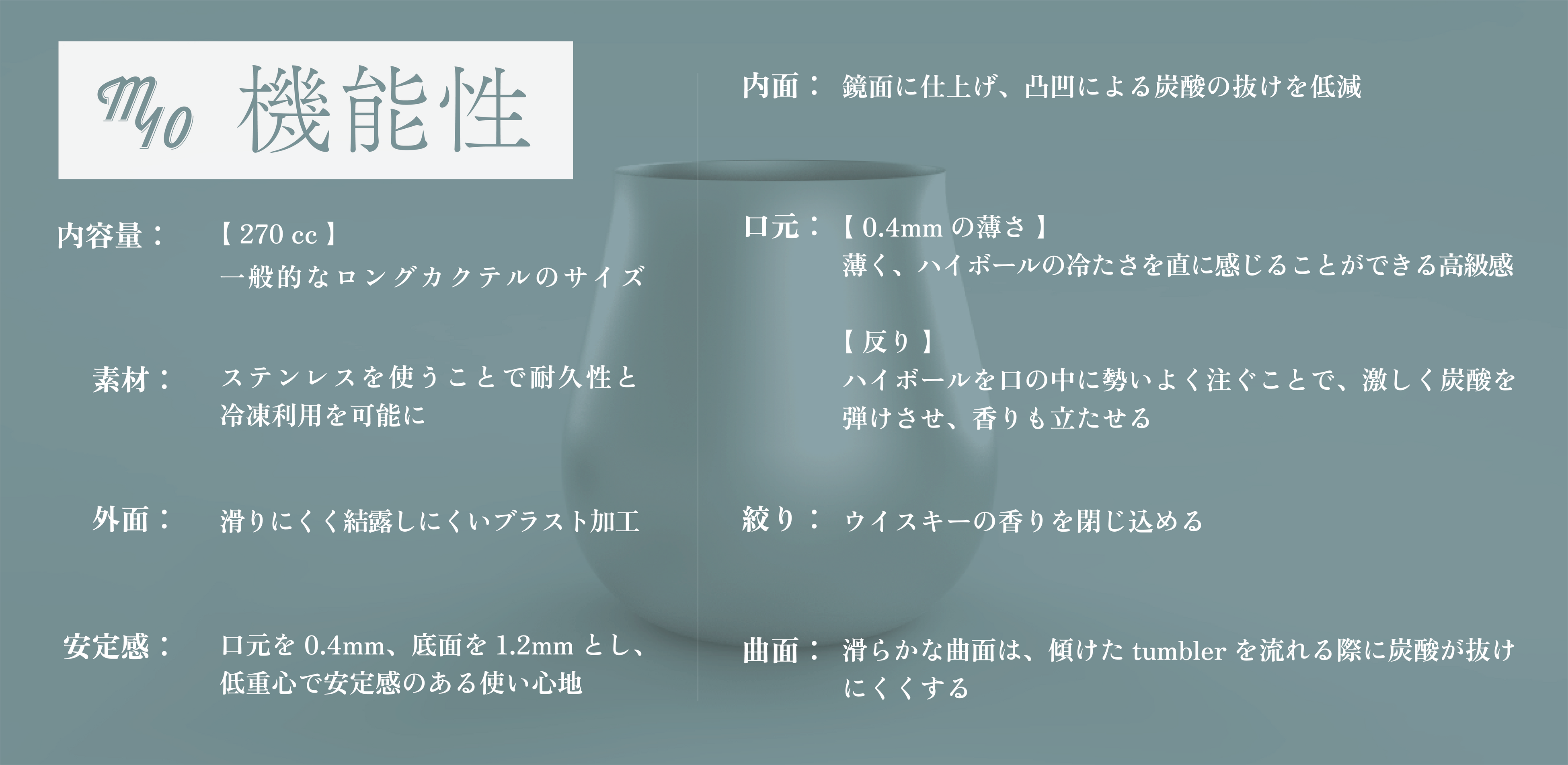 滑らかな曲面のフォルムにすることで、tumblerを傾けて丁寧に炭酸水を注いだ際に炭酸が抜けにくい効果が。また、内面を鏡面に仕上げ、凸凹による炭酸の抜けを低減。口元をわずかに反らせることで飲んだ時にハイボールが勢いよく流れ込み、ピリピリとしたきめ細やかな炭酸が口の中で上品に弾ける。さらに、耐久性に優れたステンレス製のtumblerは冷凍可能。冷凍庫でキンキンに冷やし、氷を使わずつくることで、最後まで薄まらずにハイボールを楽しめる。※自社独自基準の官能試験により、10分間は炭酸が抜けずに楽しめることを検証済み。