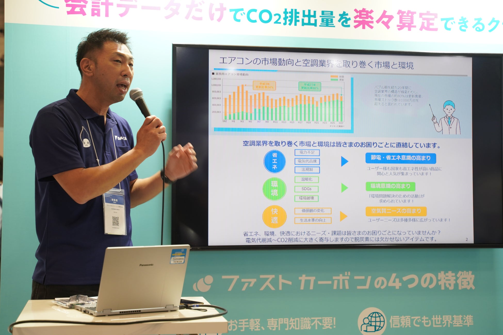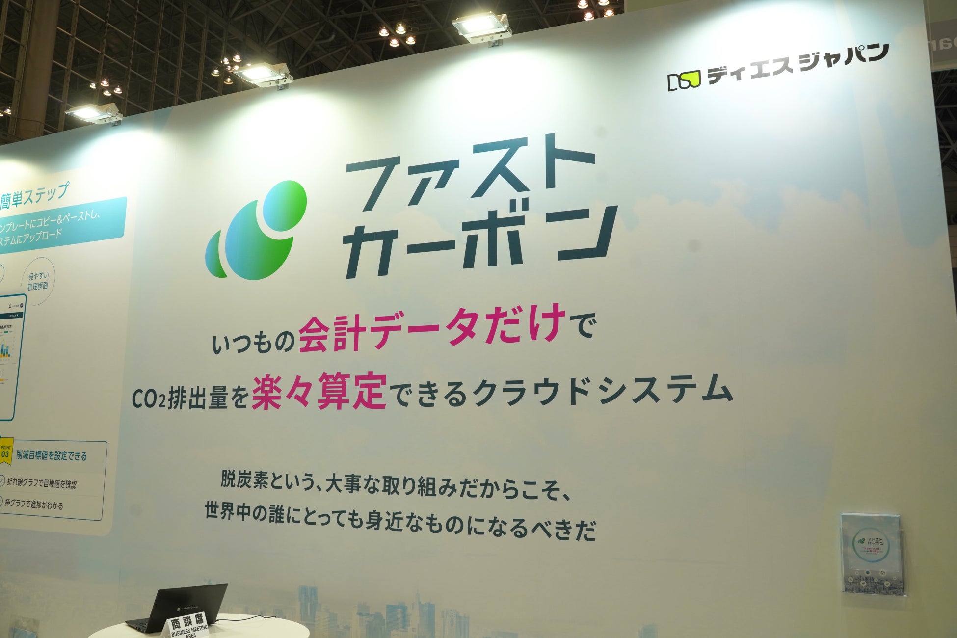 ディエスジャパンは、製造業や建設業など幅広い業界の中小企業の皆様に向け、CO2排出量を会計情報と紐づけて自動算出できる(※1)ツールである「ファストカーボン」をご提案しました。