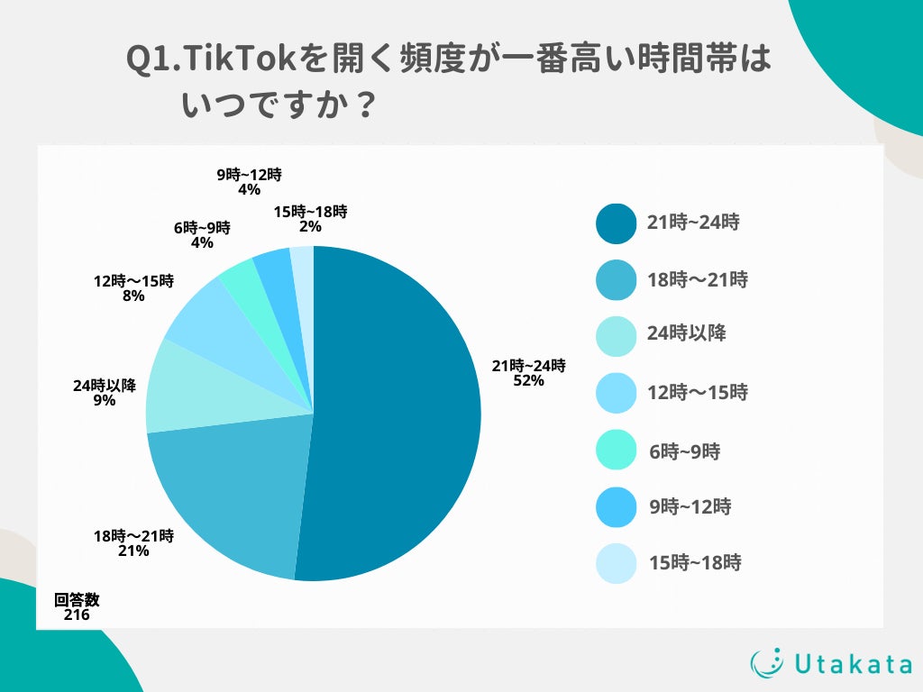 ショート動画SNSの運用やインフルエンサーキャスティングを行っている株式会社Utakata(https://utakata.co.jp/)は、10〜50代の男女216名を対象に、「TikTokを閲覧する時間帯」に関する調査を実施いたしましたので、お知らせいたします。
