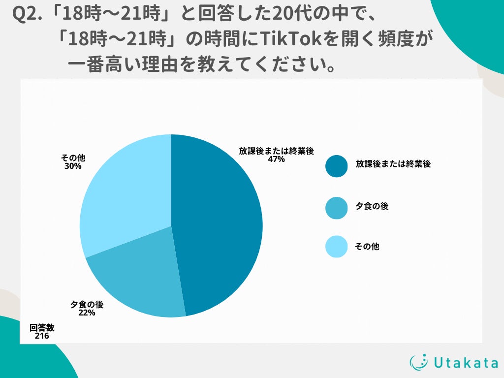 「18時〜21時」と回答した10〜20代の78名を対象に「『18時〜21時』の時間にTikTokを開く頻度が一番高い理由を教えてください。」の質問という質問を行ったところ「放課後または終業後」が47.0%、「夕食の後」が21.7%、「その他」が30.4%という結果となりました。
