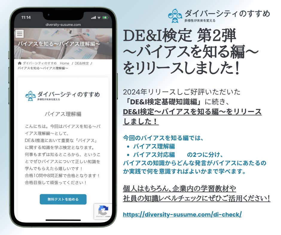 2025年6月9日、ダイバーシティのすすめ(運営企業:株式会社ColoridaStyle(東京都新宿区)、代表取締役:室田美鈴)は、DE&I検定の第2弾としてDE&I検定~バイアスを知る編~をリリース致しました。「DE&I検定※1」では、誰もが5分で簡単にDE&I推進において必要な知識を学ぶことができます。2024年に基礎知識編をリリース後、これまで多くの方に受検いただくことができました。今回は第2弾としてDE&I推進の大きなハードルとなる「バイアス」について学ぶことができる「バイアスを知る編」をリリース致しました。ご興味のある方は、お気軽に受検いただければ幸いです。