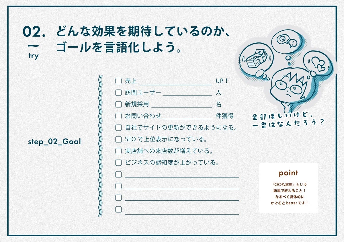リストは、分からない事だらけで、埋められなくても問題ありません。無料ヒアリング時に、ディレクターがお悩みを紐解きながら、整理していくので、空白のままリストをお持ちください。