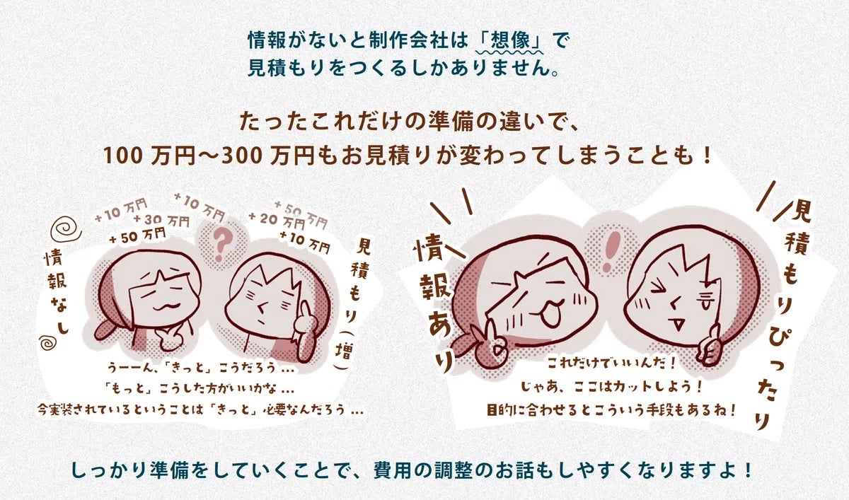 様々な制作会社に相談できるフォーマットでお作りしているので、なるべく精度の高い見積もりが欲しい、という方は是非ご活用ください。