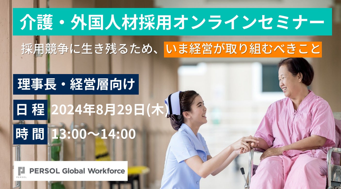 パーソルグループで外国人材に特化した人材サービスを提供するPERSOL Global Workforce(パーソル グローバルワークフォース)株式会社(本社:東京都港区、代表取締役社長:多田 盛弘)は、介護などの施設の理事長・経営層向けに、8月29日(木)に「介護・外国人材採用」に関するオンラインセミナーを開催します。なお、本セミナーの参加費用は無料です。