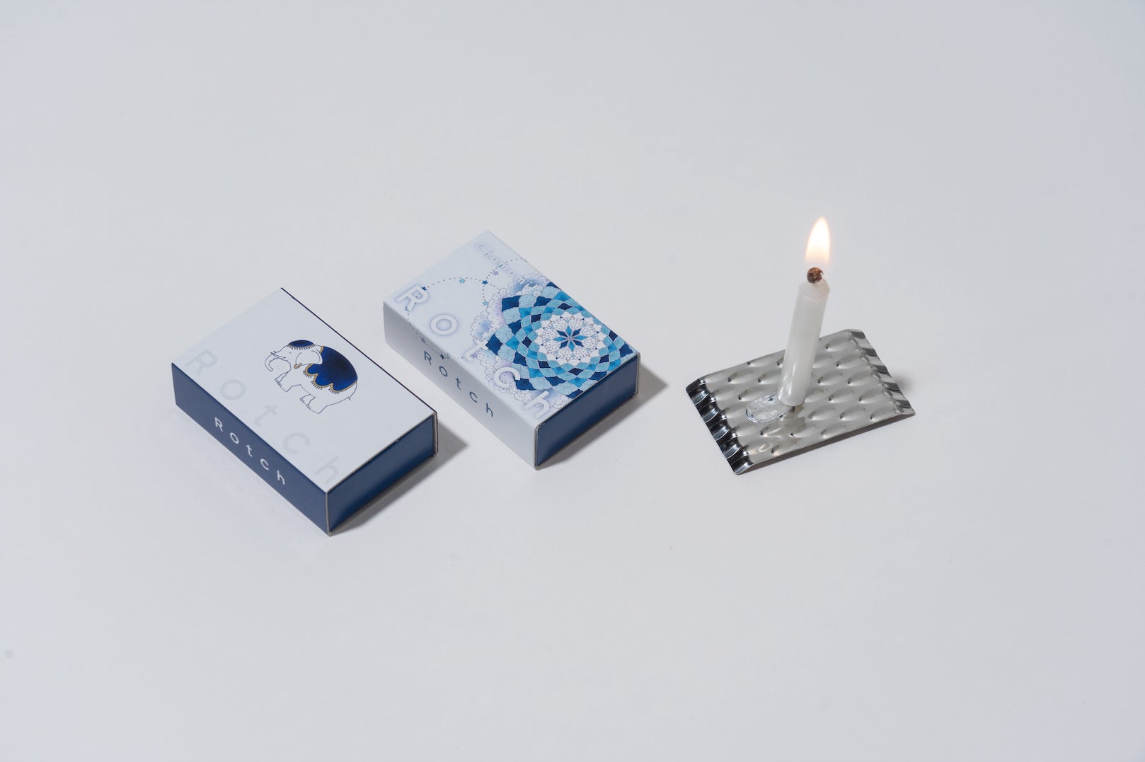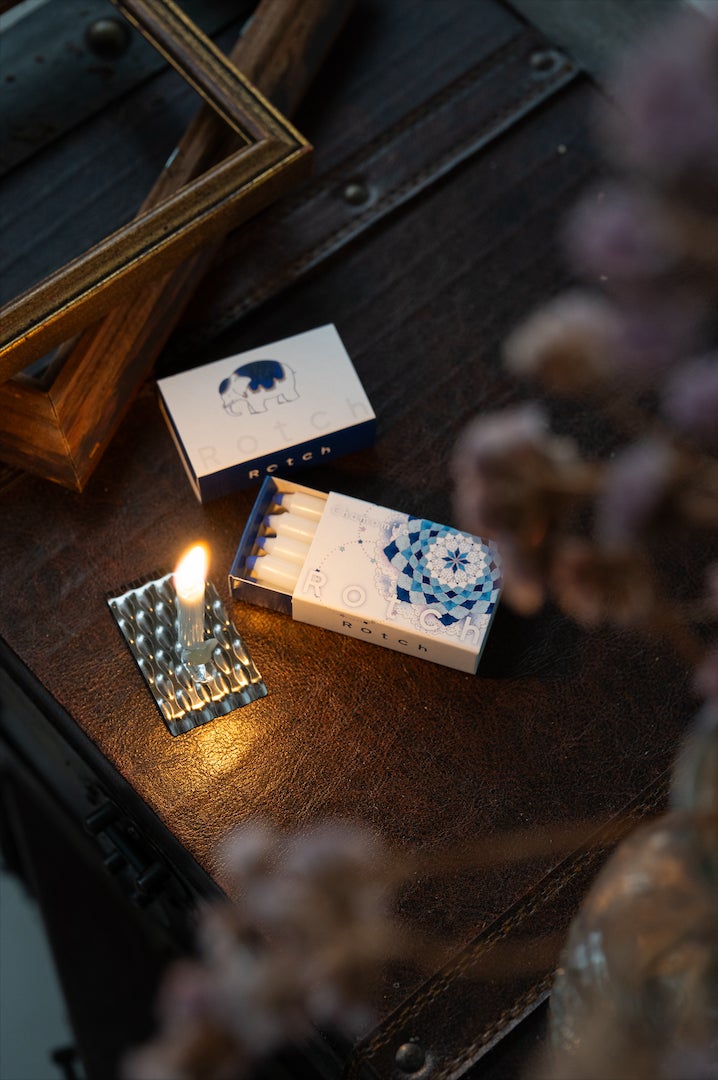 「九谷焼エディション」のローソクと燭台のパッケージには、早助千晴さんが書き下ろした図案をはじめ、数々の作品に登場する白い象が描かれています。通常は赤いローソクの頭薬も、特別に紺青をイメージした色味で制作しています。