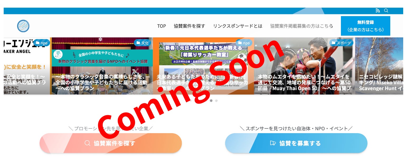 上記のバージョンアップにより、プロモーション先を見つけたい企業、スポンサーを見つけたい自治体・NPO・イベントなどお客様が分かりやすく、かつ手間なく簡単にリサーチが可能なプラットフォームへとリニューアルいたします。今回のリニューアルを機に、より多くのスポンサーとスポンシーとの接点を持ち、国内唯一の協賛プラットフォームとして最新情報を発信して参ります。