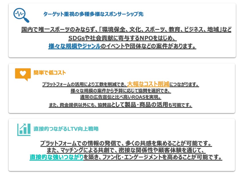 協賛を活⽤した資⾦調達や活動の認知拡⼤、 パートナー企業集めなど共創のためにプロモーション先を探している企業向けに情報発信することができ、営業リソースの削減やマッチング率を向上させることができます。