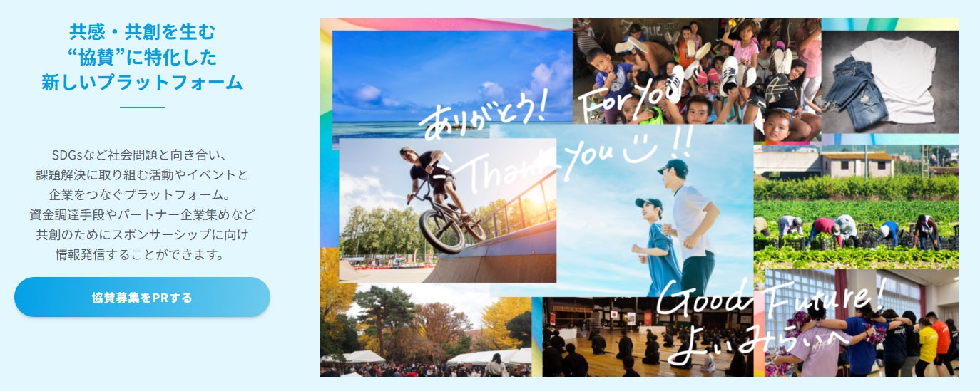 共感・共創を生む “協賛” に特化した新しいプラットフォームを含むスポンサーシップ支援サービスの総称です。 国内で唯一、スポーツ分野だけでなくSDGsなど社会問題と向き合う事業者をはじめ、様々な規模やジャンルのイベント・NPO等の団体・事業者と企業・自治体などをスポンサーシップという形で繋ぎ、資金調達やマーケティング戦略としての支援を行うサービスです。