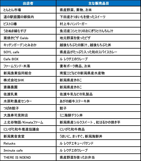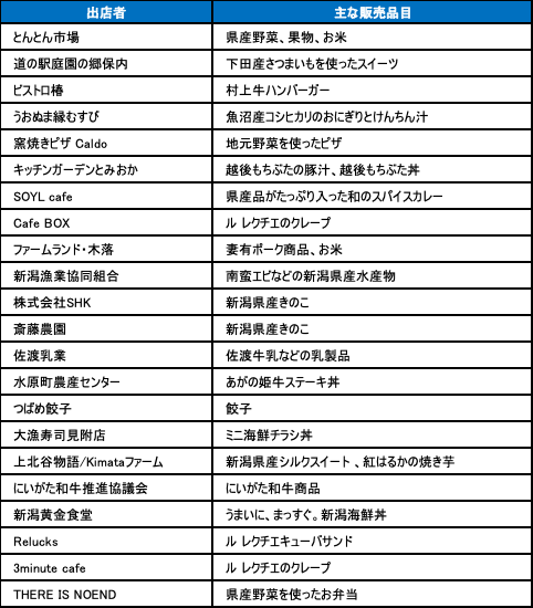 本フェアでは、新潟県産の新鮮な農産物や水産物を取り扱う直売所や、県内の人気飲食店、キッチンカーなど、約20店舗が集結。出店者たちは、新潟の豊かな食材を活かした特別なメニューや商品を提供し、訪れる方々に新潟の食の魅力を味わっていただきます。