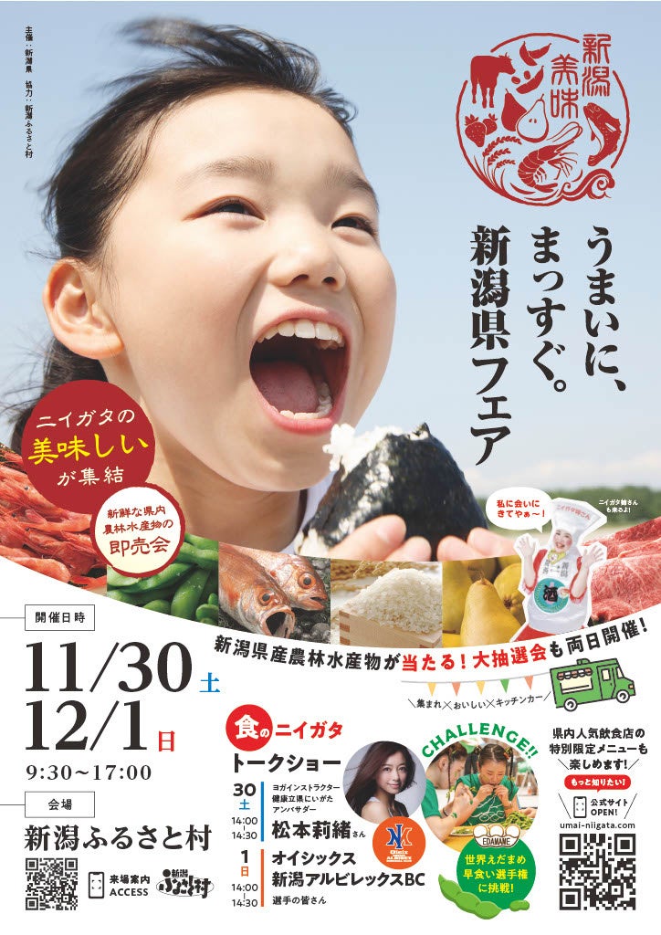 新潟県農林水産部は、地元の美味しい農林水産物を広く皆様に知っていただくため、「うまいに、まっすぐ。新潟県フェア」を11月30日(木)と12月1日(金)の2日間にわたり、新潟市の「新潟ふるさと村」にて開催します。