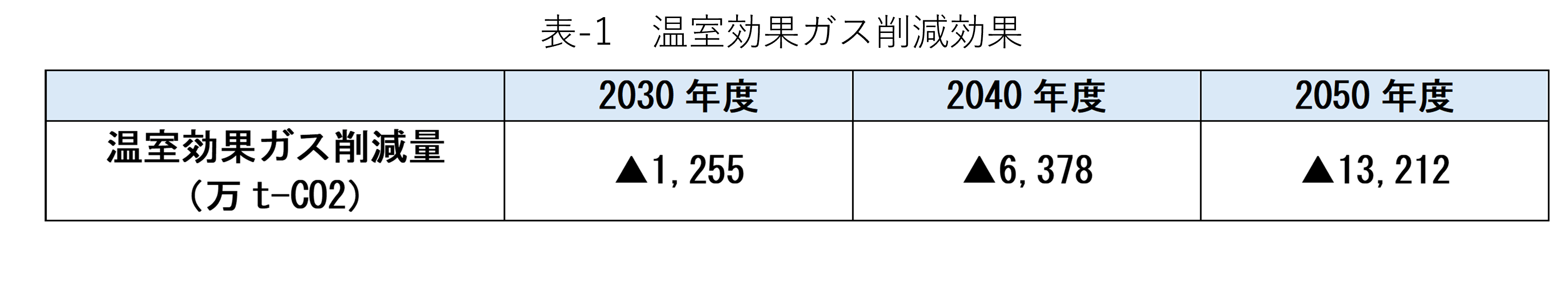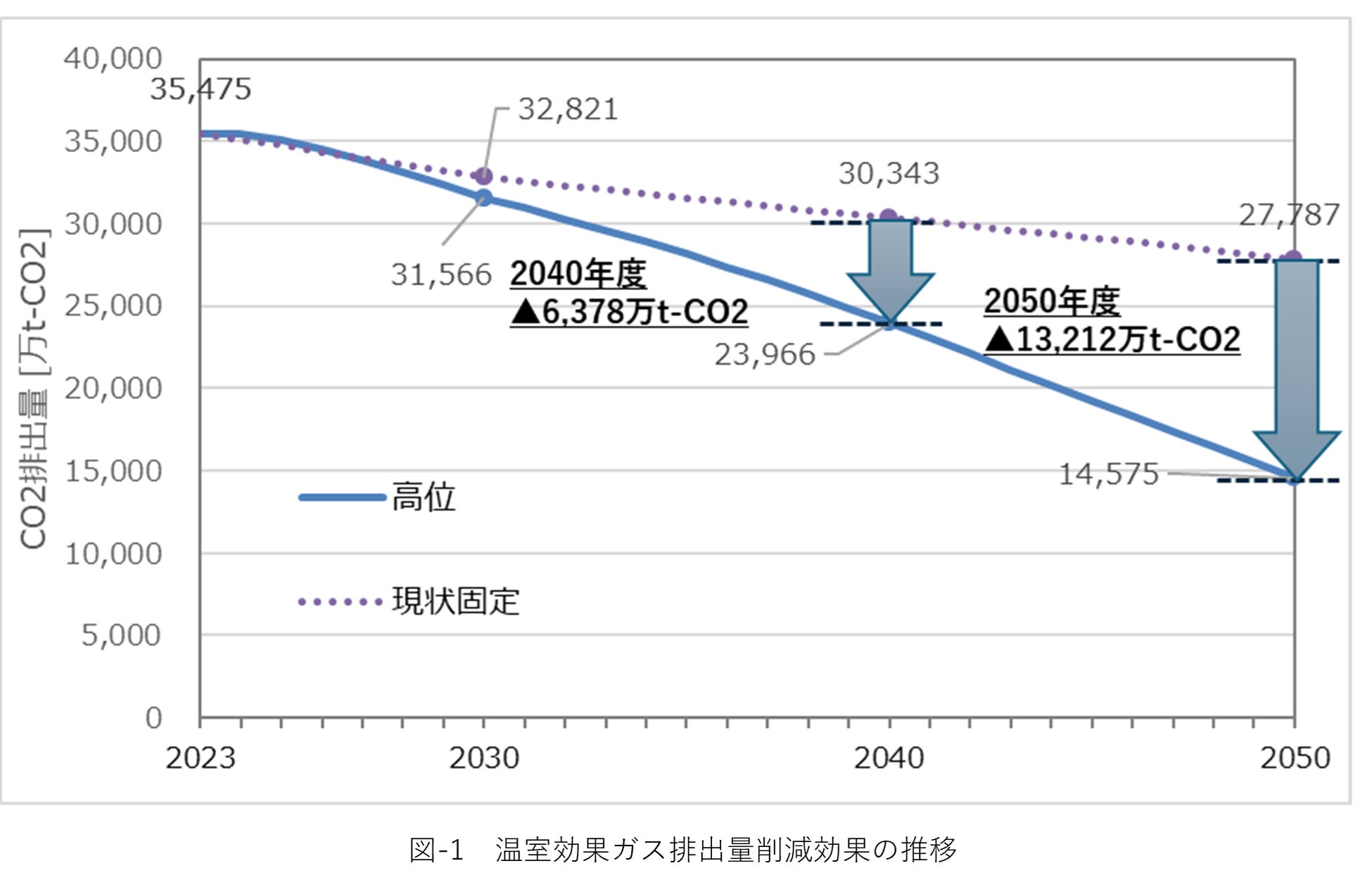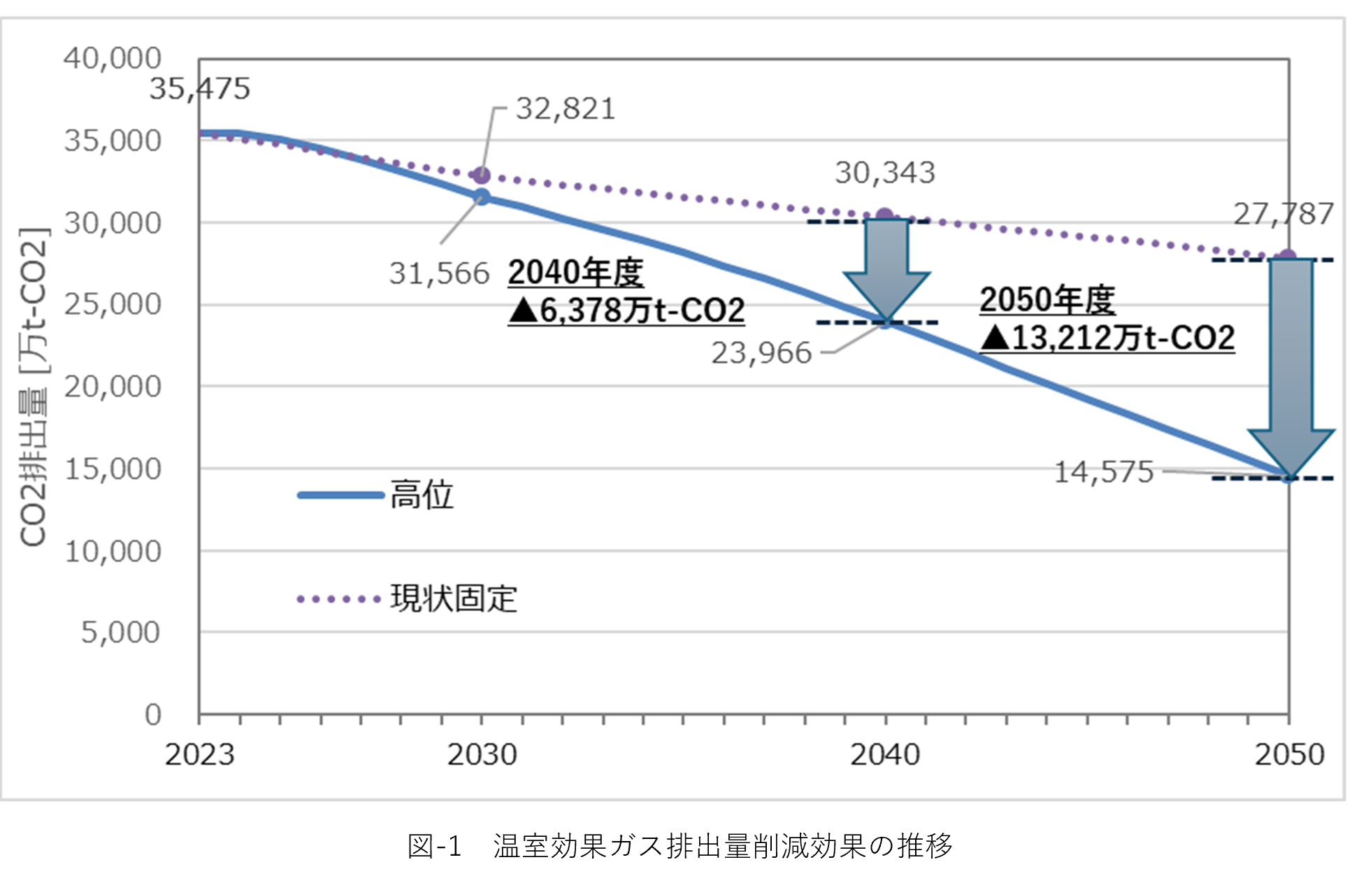 将来的な普及における高位シナリオ※1の温室効果ガス排出量の削減量は、現状固定シナリオ※2と比較し、2040年度で▲6,378万トン、2050年度で▲13,212万トンとなりました。これは「地球温暖化対策計画」における2040年度の削減目標(2013年度比▲10.3億トン)の約6%、2050年度の目標(2013年度比▲14.1億トン)の約9%に相当します。