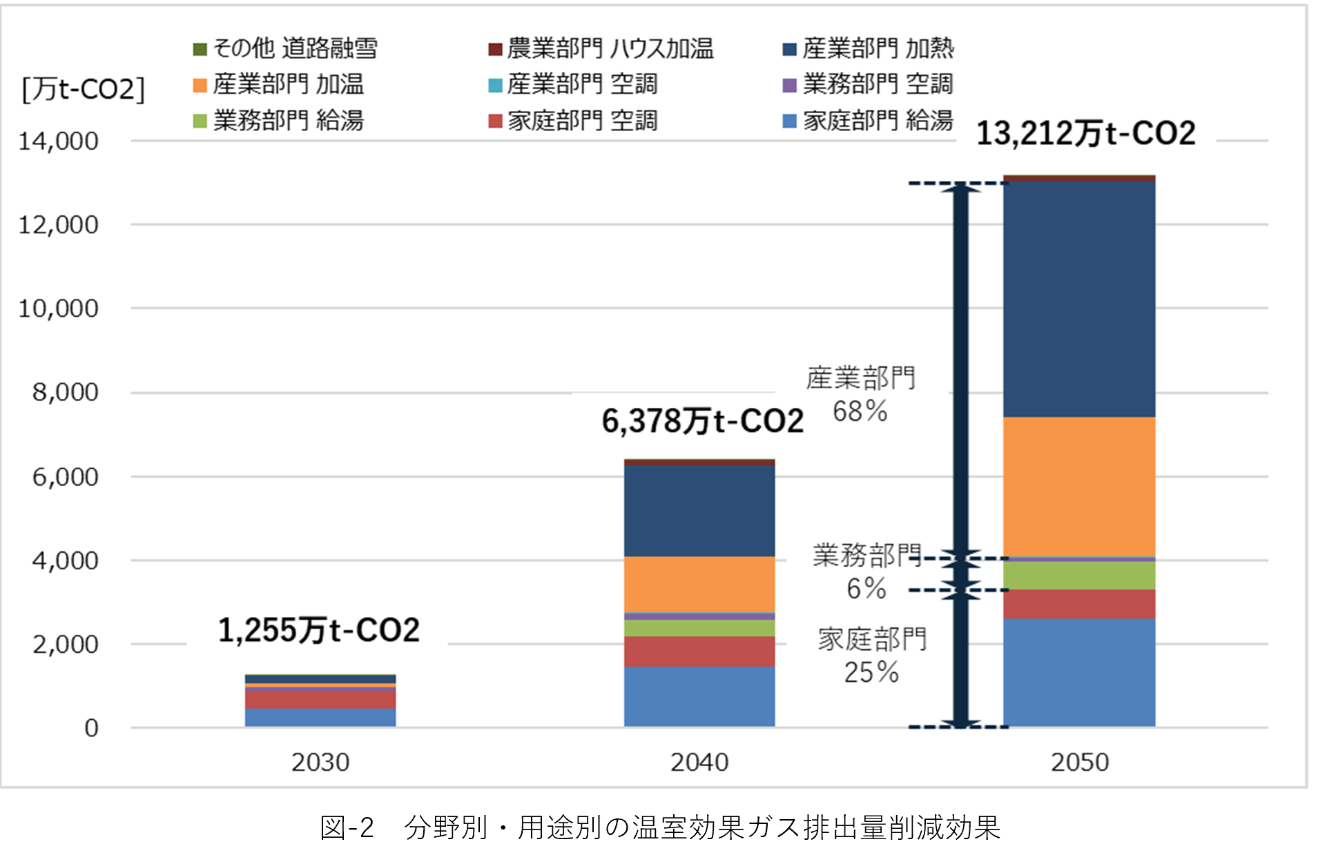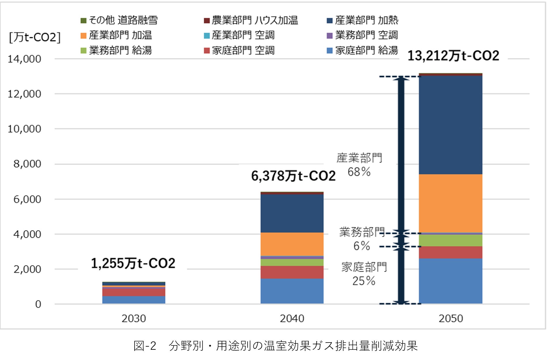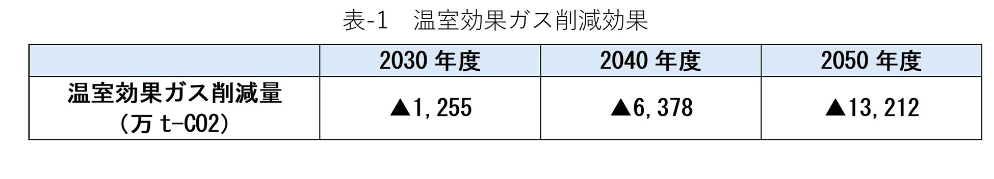 将来的な普及における高位シナリオ※1の温室効果ガス排出量の削減量は、現状固定シナリオ※2と比較し、2040年度で▲6,378万トン、2050年度で▲13,212万トンとなりました。これは「地球温暖化対策計画」における2040年度の削減目標(2013年度比▲10.3億トン)の約6%、2050年度の目標(2013年度比▲14.1億トン)の約9%に相当します。