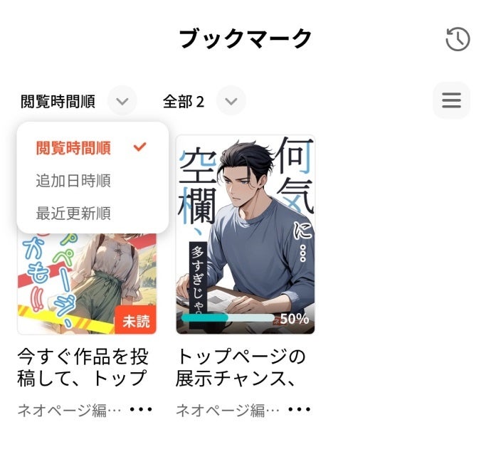 気になった作品はブックマークできる機能も完備。閲覧時間順、追加日時順、最近更新された作品順にも整理でき、読みたい作品をいつでも呼び出すことができます。