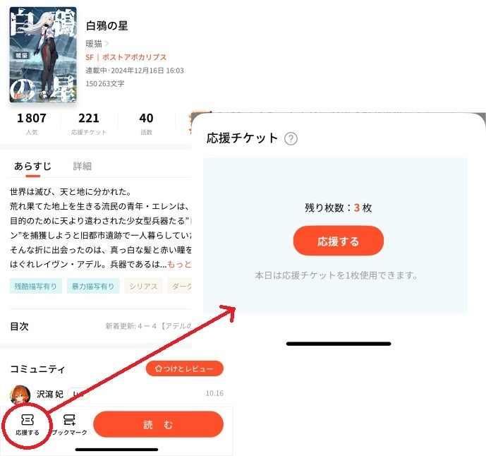1日に3枚配布される応援チケットを使用して、手軽に作品を応援することが可能です。
