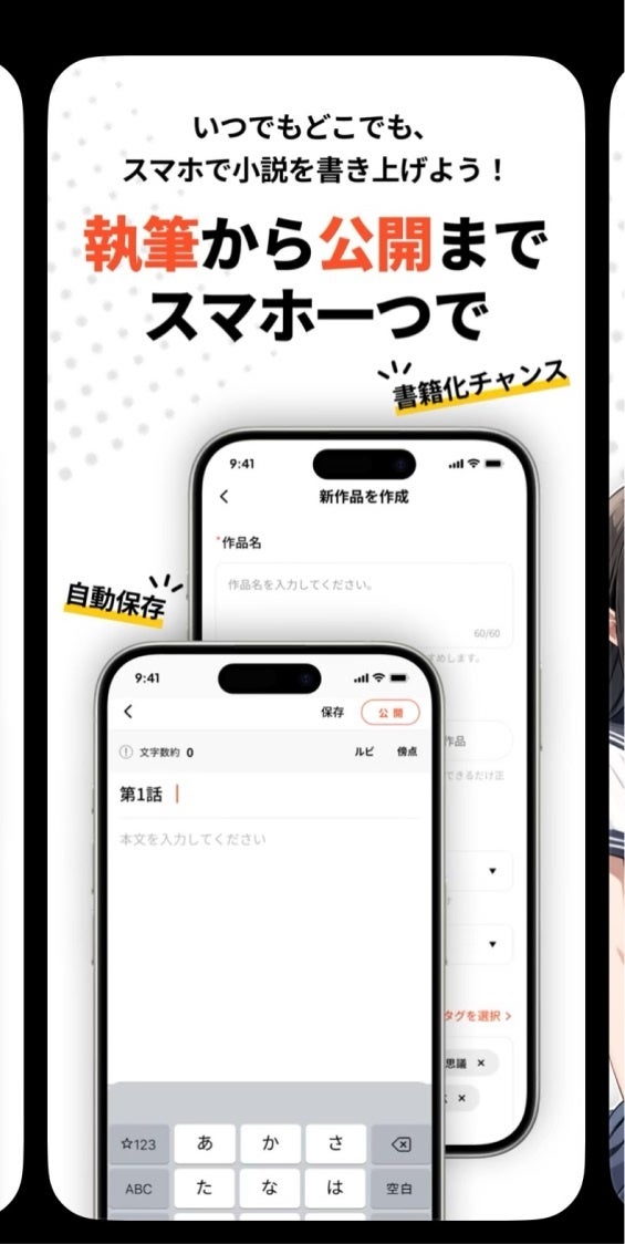 作品を読むだけではなく、執筆するツールも充実しています。作品の進捗はリアルタイムで保存できる機能も完備。書いた作品は即時公開はもちろん、時間を予約して投稿することも可能。いつでもどこでも気軽に小説の執筆を楽しめます。