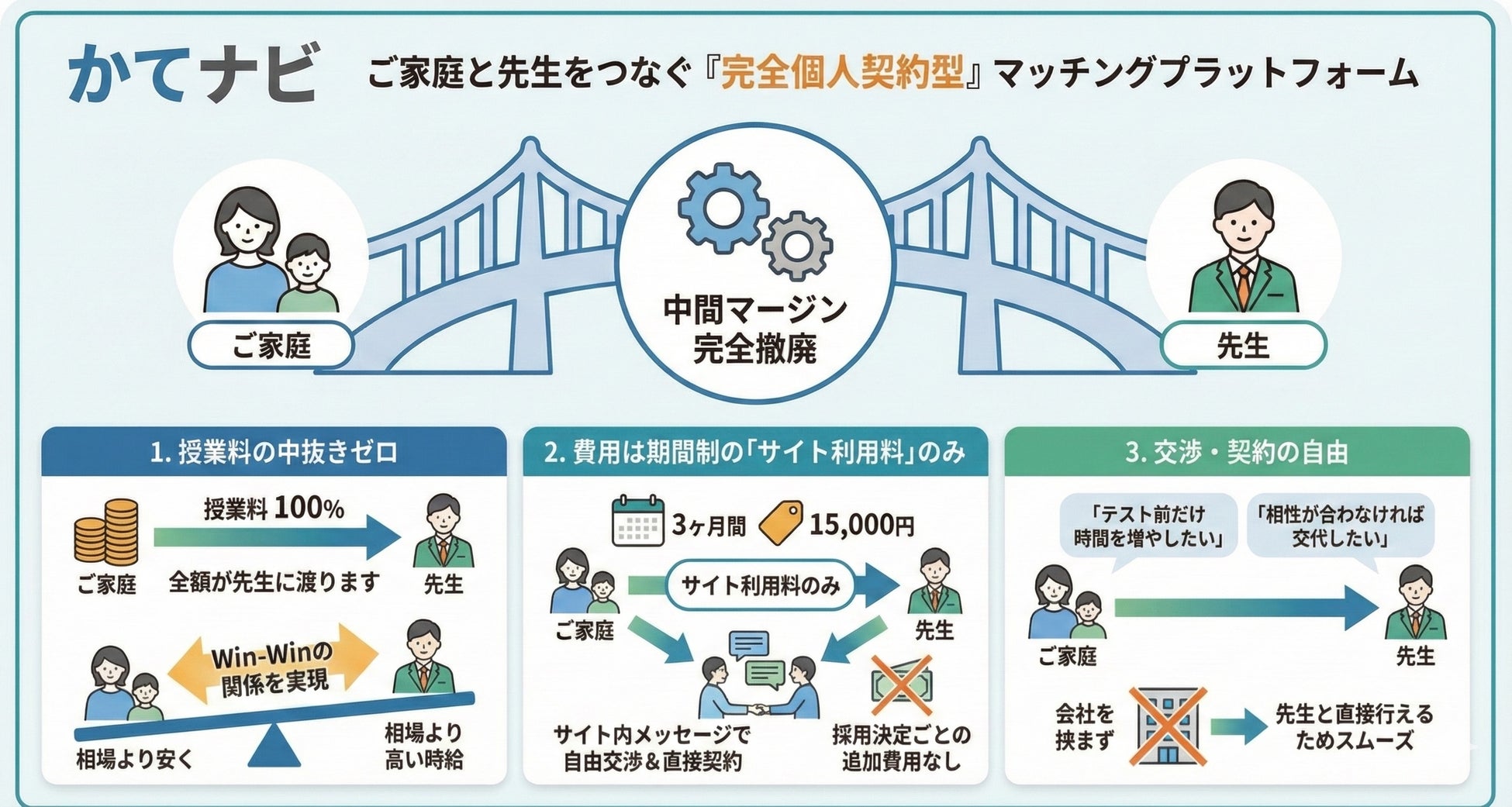 「かてナビ」は、中間マージンを完全撤廃した、ご家庭と先生をつなぐ「完全個人契約型」のマッチングプラットフォームです。