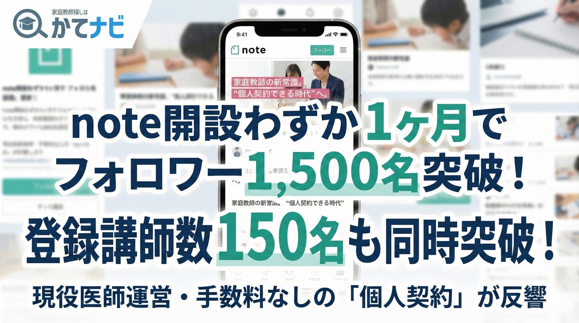 【家庭教師個人契約 かてナビ】note開設わずか1ヶ月でフォロワー1,500名を突破!「手数料なし」の透明性と、現役医師が明かす「良い先生を見抜く7つの質問」が保護者の支持を獲得