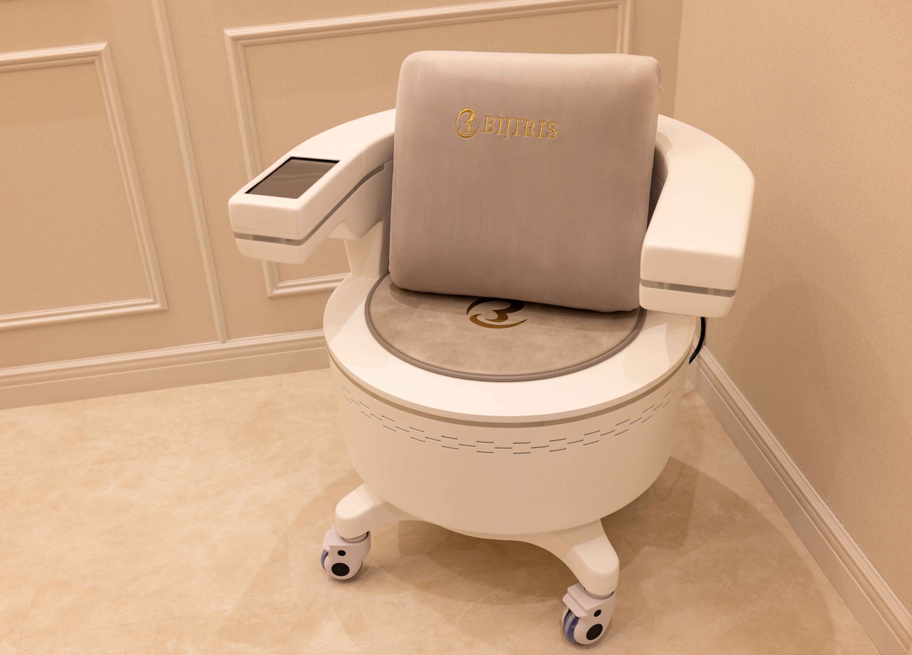 たった15分座るだけで、骨盤底筋を効果的に鍛えることができる電磁パルストレーニングチェア「BIJIRIS (ビジリス)」。業界ナンバーワンクラスのハイパワーで、インナーマッスルにアプローチし、効率的にトレーニングができます。産後の女性や尿もれが気になる方、腰痛がある方、ヒップアップしたい方にもおすすめです。