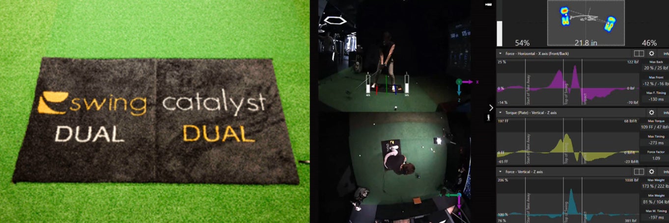 世界のトップゴルファーたちが愛用する、最新のスイング解析機器「Swing Catalyst Dual(スイングカタリストデュアル)」。足裏測定器により、スイング中の足裏のバランスや圧力、さらにメインフォース(直線運動)とトルク(回転運動)など、目では捉えられない力のほぼ全てを科学的に分析できます。