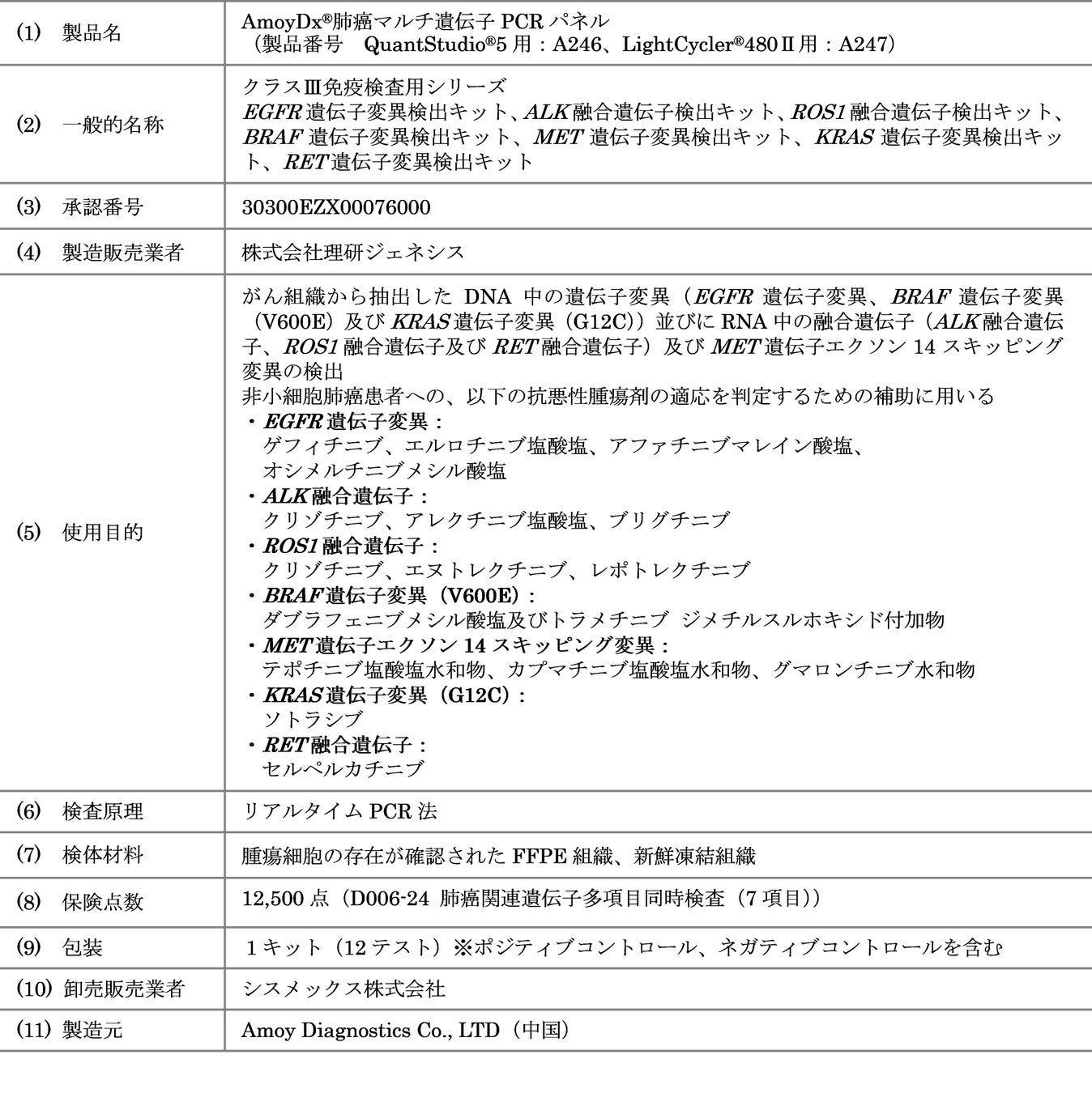 株式会社理研ジェネシス(本社:東京都品川区、代表取締役社長:岩壁賢治)は、体外診断用医薬品「AmoyDx®肺癌マルチ遺伝子PCRパネル」(以下「本製品」)について、日本化薬株式会社(本社:東京都千代田区、代表取締役社長:涌元厚宏)が製造販売承認申請中の「ROS1融合遺伝子陽性の切除不能な進行・再発の非小細胞肺癌」を対象とした「Taletrectinib」のコンパニオン診断薬として、製造販売承認事項一部変更申請を厚生労働省に行いましたことをお知らせいたします。
