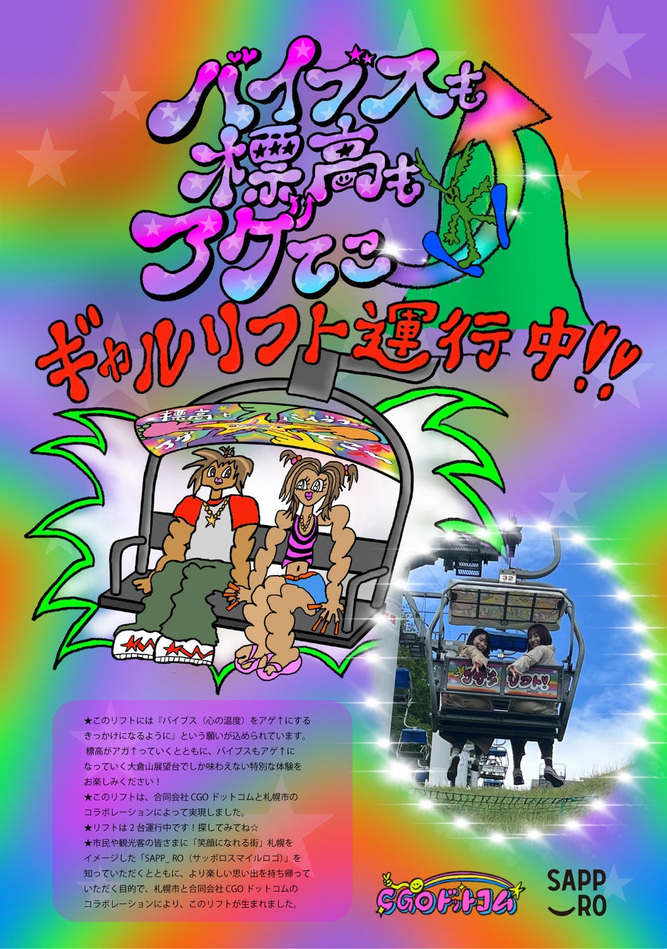 これは、札幌市の職員研修「ギャル式ブレスト®」で生まれたアイデアをもとに、市民や観光客の皆さまに、より楽しい思い出を持ち帰っていただくことを目的に令和5年に誕生しました。研修を担当した合同会社CGOドットコムが手掛けた天蓋及び背面のデザインには、「バイブス(心の温度)」をアゲ⤴にするきっかけになるように」という願いが込められています。