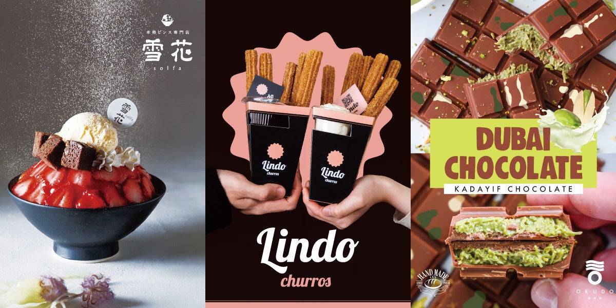本格ピンス(韓国かき氷)専門店『雪花 -solfa-』や、東京・新大久保で話題のOKUDOが提供する『ドバイチョコレート』、オーブンで香ばしく仕上げ「見て楽しい、食べて美味しい」チュロスが人気の『Lindo churros』など、SNSでも注目を集めるトレンドスイーツをラインナップ。