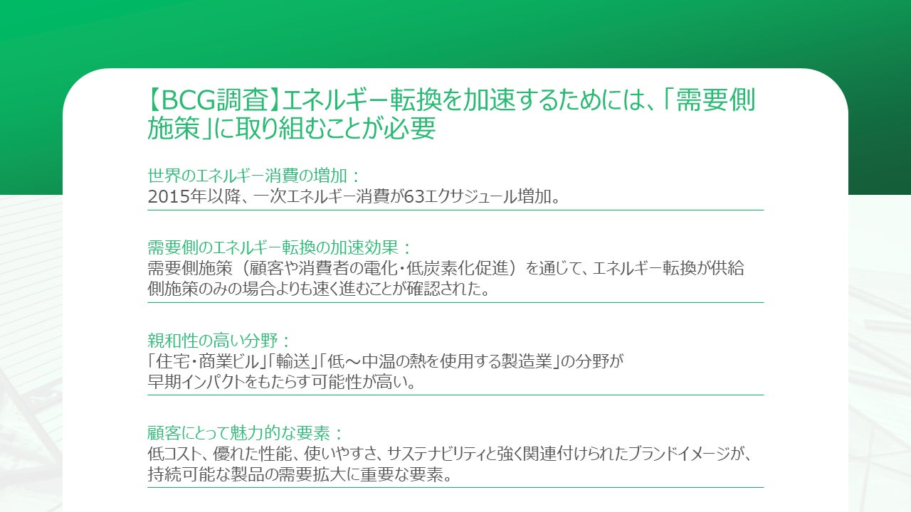 【BCG調査】エネルギー転換を加速するためには、「需要側施策」に取り組むことが必要