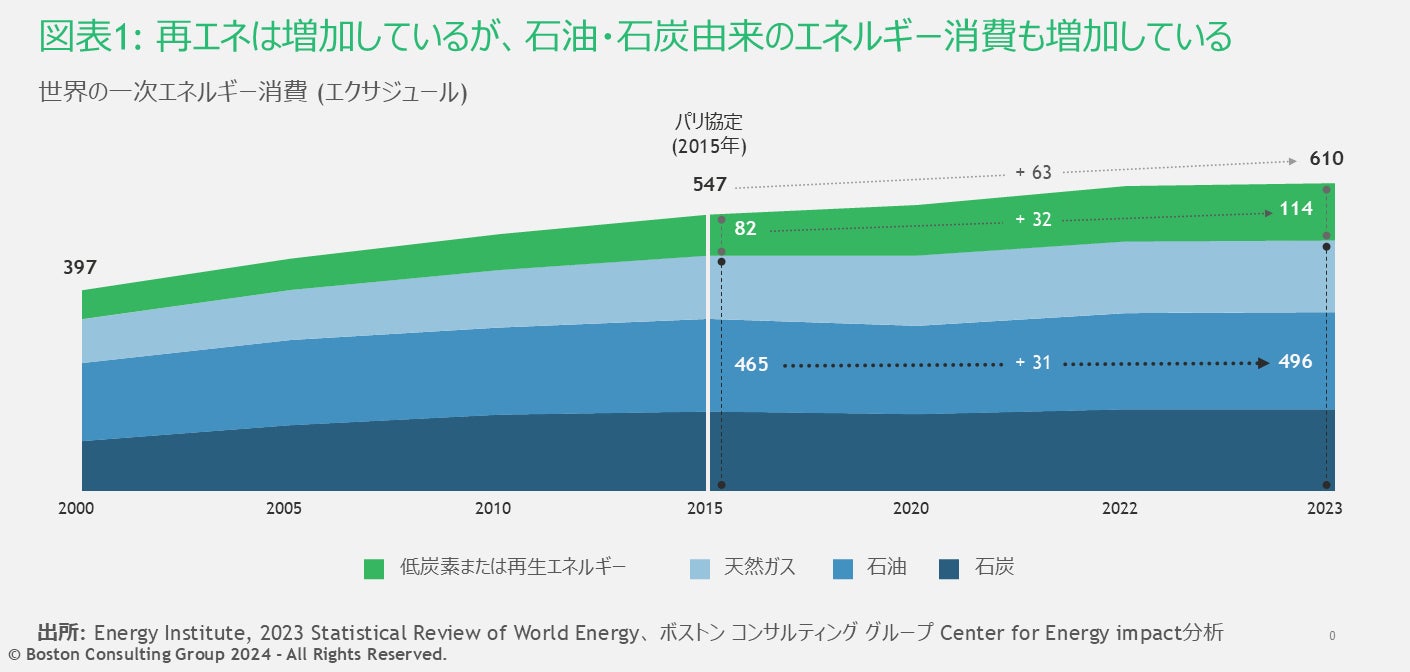 パリ協定が採択された2015年以降、世界全体の一次エネルギー消費は63エクサジュール増加しました(図表1)。エネルギー供給側の取り組みによって、増加分のうち32エクサジュールは低炭素発電(水力・原子力)や再生可能エネルギー(風力・太陽光など)由来の消費となっています。一方、化石燃料由来の消費も計31エクサジュール増加しています。