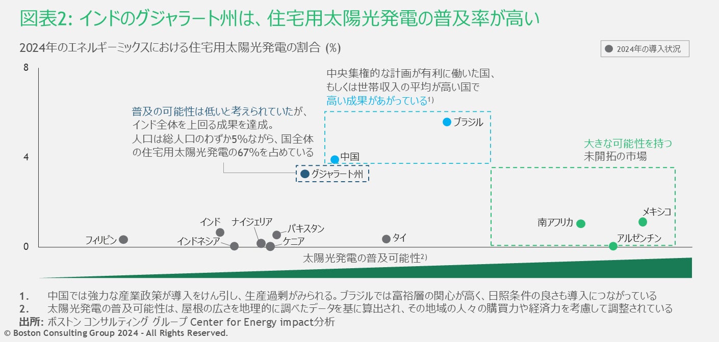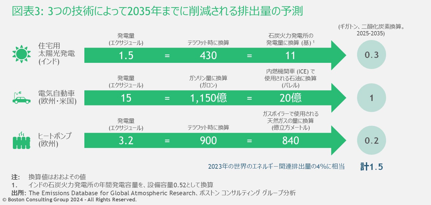 レポートでは、需要側施策によるエネルギー転換の加速化の事例として、インドにおける住宅用太陽光発電(図表2)、欧州・米国における電気自動車、欧州におけるヒートポンプを取り上げています。これらの技術による2035年までの削減量は、2023年の世界のエネルギー関連排出量全体の4%に相当する計1.5ギガトン(CO2換算)にのぼる可能性があります(図表3)。