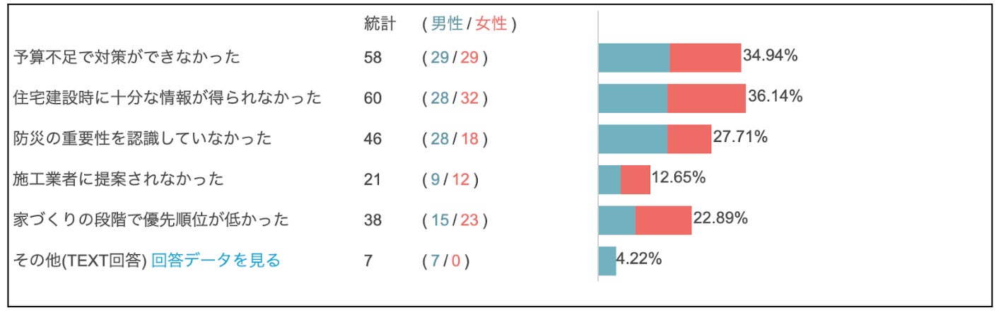 特に、事前に必要な情報が不足していたことが主な理由として挙げられており、これは我々のような第三者的な立場から相談に乗れる住宅相談窓口の認知不足と、住宅メーカー側の情報提供の不足が原因だと考えられます。一般の方々がこれらの必要な情報を収集するのは容易ではなく、自然災害が頻発する鹿児島県において、専門的なアドバイスは不可欠です。