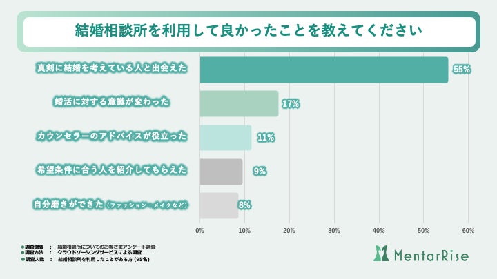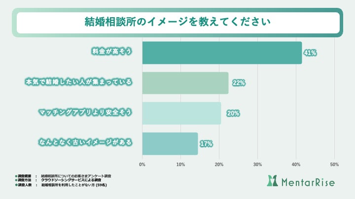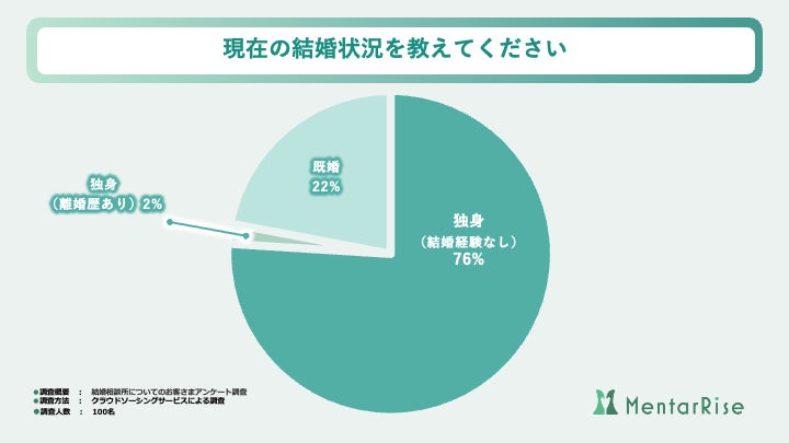 株式会社MentarRise (本社:東京都渋谷区、代表取締役:鈴木 寿治)は、「インターネットを介したBtoCサービス」を提供する企業として、常に市場のニーズを把握し、ユーザーに最適なサービスを提供することをめざしています。そこで、当社では市場の現状を正確に把握し、新規事業戦略に活かすために「結婚相談所」について、ユーザーの男女100人を対象にアンケート調査を行いましたので、その結果を報告します。