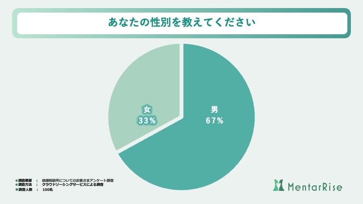 当アンケートは、結婚についての関心のあるお客さまを対象に行いましたところ、「男性:67%」「女性:33% 」という調査対象の構成になっています。