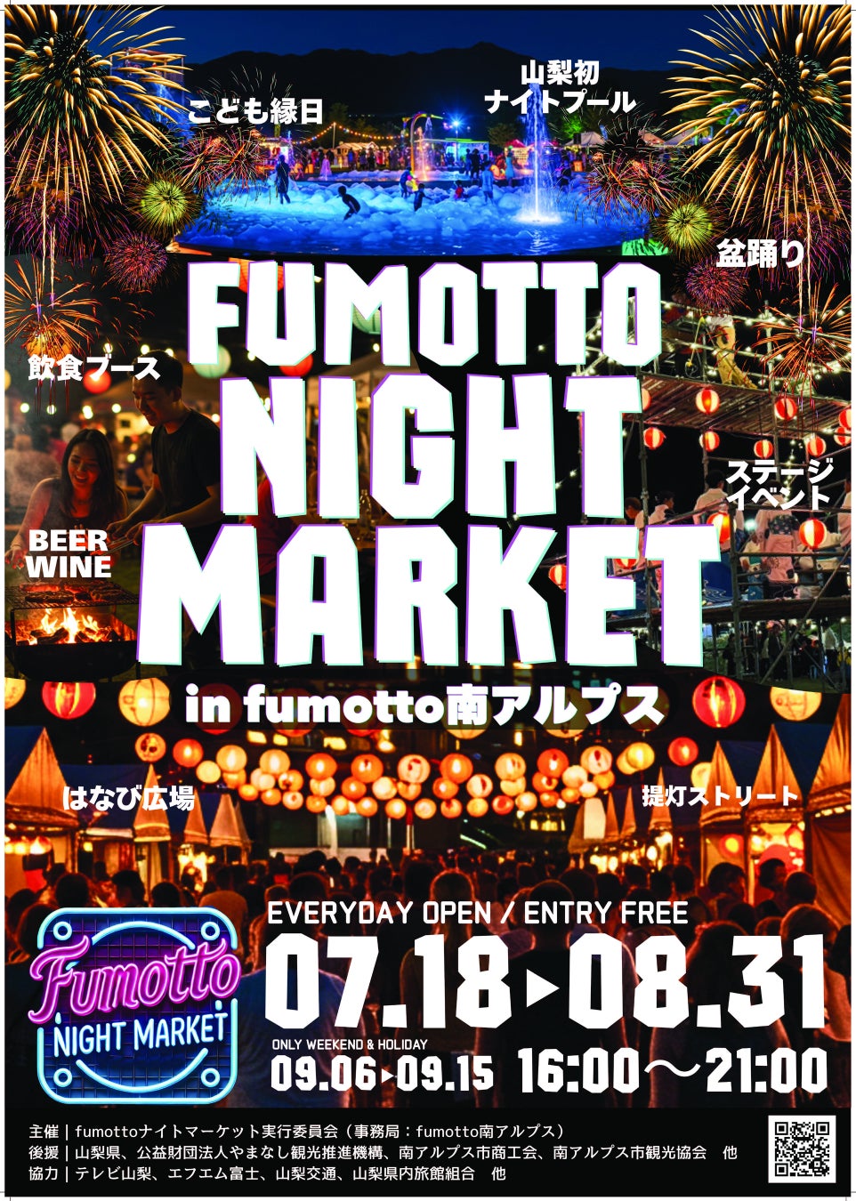2025年7月18日(金)から8月31日(日)までの夏休み期間、南アルプスIC前「fumotto南アルプス」において、山梨初となる本格的なナイトマーケットを毎晩開催します。会場は、ネオン看板と2,000個の提灯で幻想的に彩り、非日常的な夏の夜を演出します。さらに、地元の食材を使ったグルメブースやワイン&ビアバー、農産物や加工品、クラフト雑貨やアンティックの販売など、多彩な店舗が出店します。