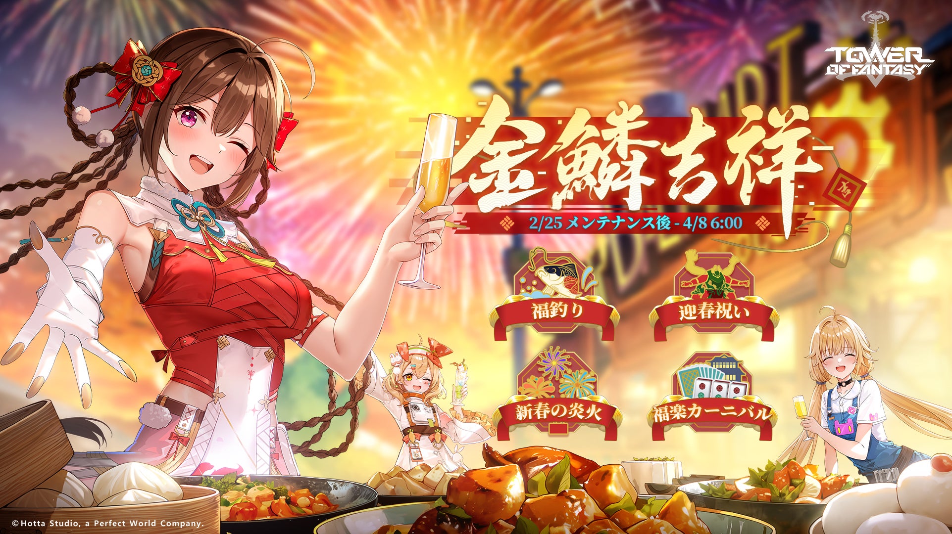 イベント期間中、【喜楽カーニバル】、【福釣り】、【迎春祝い】、【新春の炎火】の4つのシリーズイベントに参加し、金鱗の欠片を集めることで、イベント商店にてエナジー粒子・オレンジやレッドコア、権限者コスチューム「躍動ファッション」などの豪華報酬と交換できます。