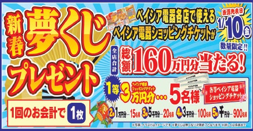 ベイシア電器では、お客様のご来店を心よりお待ちしております。全店合計・総額160万円分が当たる!「夢くじプレゼント」や「タイムセール」など、お得なイベント盛りだくさんの初売りをぜひご利用ください。