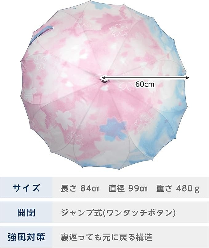 仕様: 全長84cm / 直径99cm / 重量480g / 16本骨 / ジャンプ傘 / 雨晴兼用