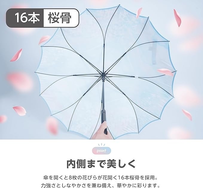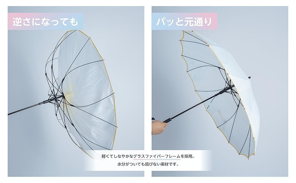 傘を内側から見上げると、16本の骨がまるで桜の花びらのように見える優美なフレーム「桜骨」が特徴です。この美しい見た目だけでなく、フレームには軽くてしなやかなグラスファイバーを使用。強風で反り返っても元に戻りやすく、錆による劣化も防ぎ、永く愛用できる耐久性を実現しました。(スタッフ平均使用年数7年)