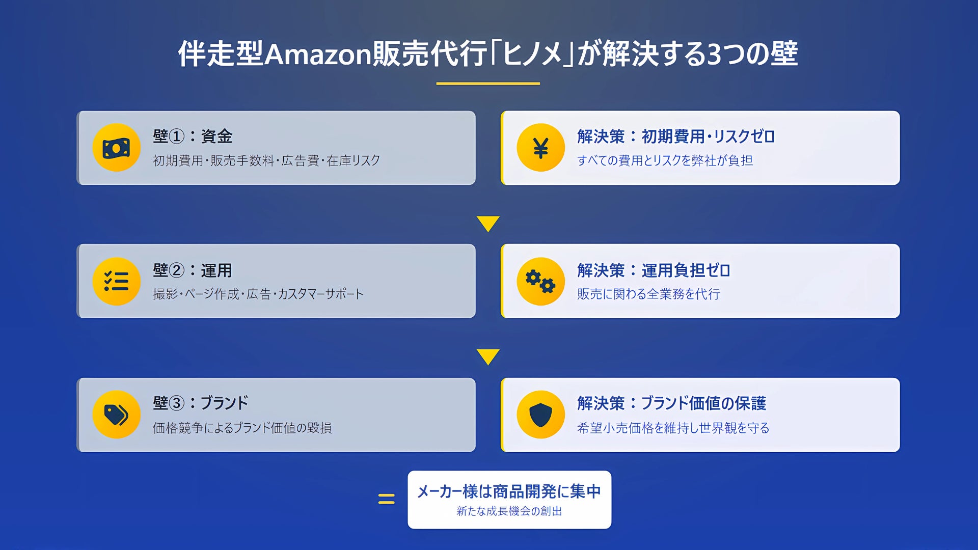 「ヒノメ」は、こだわりの商品づくりを行うメーカー様のために、販売面での課題を解決し、新たな成長機会を創出する伴走型のAmazon販売代行サービスです。メーカー様が抱える「資金・運用・ブランド」の3つの壁を取り払い、商品開発に集中できる環境を提供します。