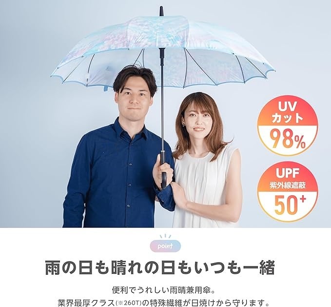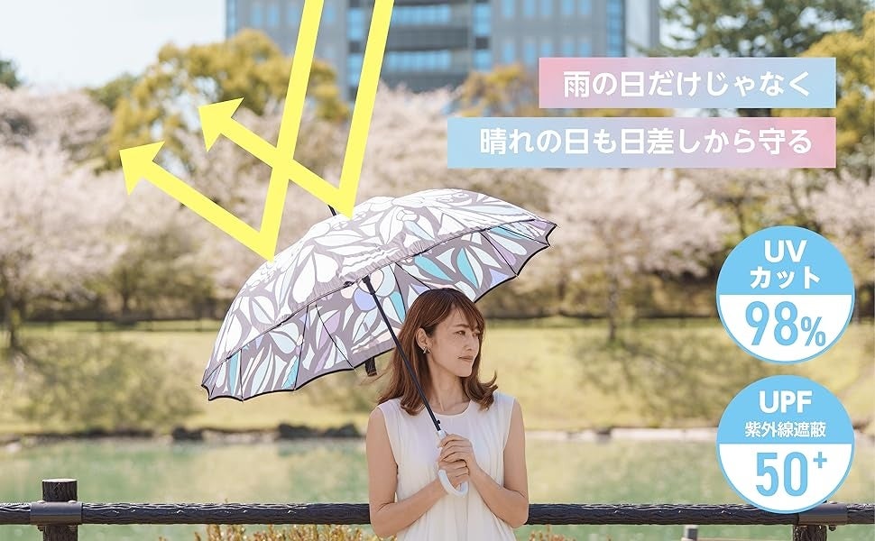高密度(260T)に編まれた生地により、UVカット率98%・UPF50+という高い紫外線遮蔽効果を発揮。強い日差しからも肌を守る日傘として、季節を問わず活躍します。