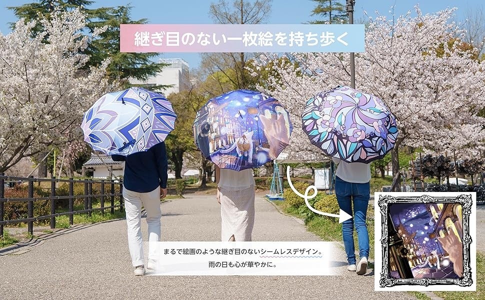 傘の生地を一枚のキャンバスに見立てた「一枚張り」製法を採用。一般的な傘と異なり生地の継ぎ目がなく、描かれたデザインが途切れることなく広がります。まるで絵画を携えるように、雨の日のお出かけを特別な体験へと変えてくれます。