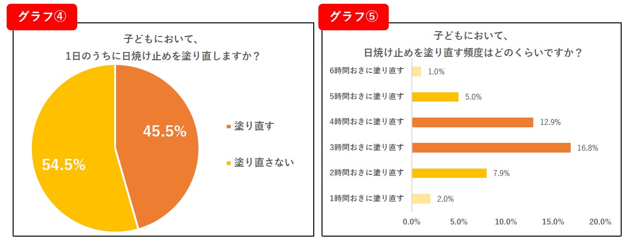 子どもがいる方に向けて、「子どもにおいて、1日のうちに日焼け止めを塗り直しますか?塗り直す場合、どれくらいの頻度で塗り直しますか? 」と同様の質問をしたところ、「塗り直している」は45.5%と半数弱という結果となりました。(グラフ④)最も多い頻度は3時間おき、次いでほぼ同程度で4時間おきと、大人と近しい結果となりました。(グラフ⑤)