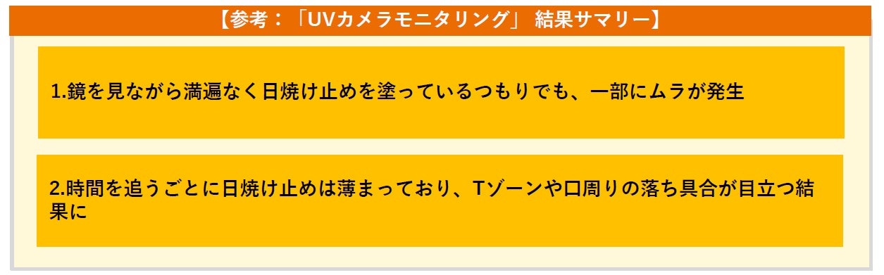 また、ある女性の1日の生活の中で、日焼け止めはどれだけ・どのように落ちるのか確認する「UVカメラモニタリング」を実施しました。