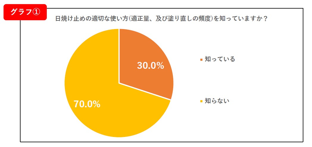 「日焼け止めの適正量を知っていますか?」、「日焼け止めの適正な塗り直しの頻度を知っていますか?」というそれぞれの質問に対して、どちらにも「知っている」と答えた人は、わずか30.0%に留まる結果となりました。(グラフ①)70.0%の方が、日焼け止めの適切な使い方を特に気にせずに使用していることが伺えます。