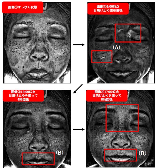 画像②と比較して、画像③、画像④は全体の色が黒からグレーへ薄まっていることがわかります。特にTゾーンや口周りの白さが目立ちました。(B)実際の行動として、食事と歯磨きをしたことから日常的な行動が日焼け止めの落ちやすさに繋がっていることが見受けられました。