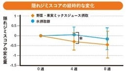 にんじんを主とした野菜・果実ミックスジュースを毎日200ml、8週間飲み続けたグループと、同量の水を飲み続けたグループの隠れジミスコアを比較。その結果、野菜・果実ミックスジュースを飲んだグループは水を飲んだグループに比べて、1カ月で隠れジミスコアが改善しました。また、血中のβ-カロテン濃度が高い人ほど隠れジミスコアが改善する傾向もみられました。