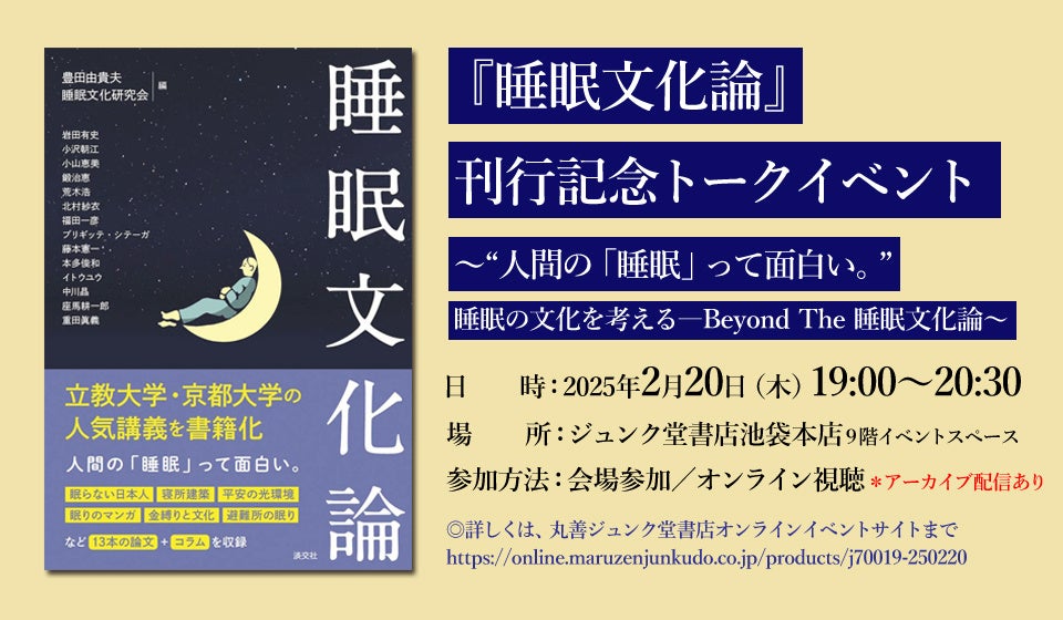 2月20日(木)19時より、ジュンク堂書店池袋本店にて刊行記念オンライントークイベント「“人間の「睡眠」って面白い。”睡眠の文化を考える―Beyond The 睡眠文化論」が開催されます。登壇者は本書の編者で睡眠文化研究会所属メンバーである豊田由貴夫先生(立教大学名誉教授/浦和大学教授)、同メンバーの福田一彦先生(江戸川大学特任教授)に加え、ゲストスピーカーとして講義を担当した北村紗衣先生(武蔵大学教授)の3名。イベントでは“Beyond The 睡眠文化論”として、本書に掲載されている内容から、派生した話題まで豊富にお話する予定です。乞うご期待!